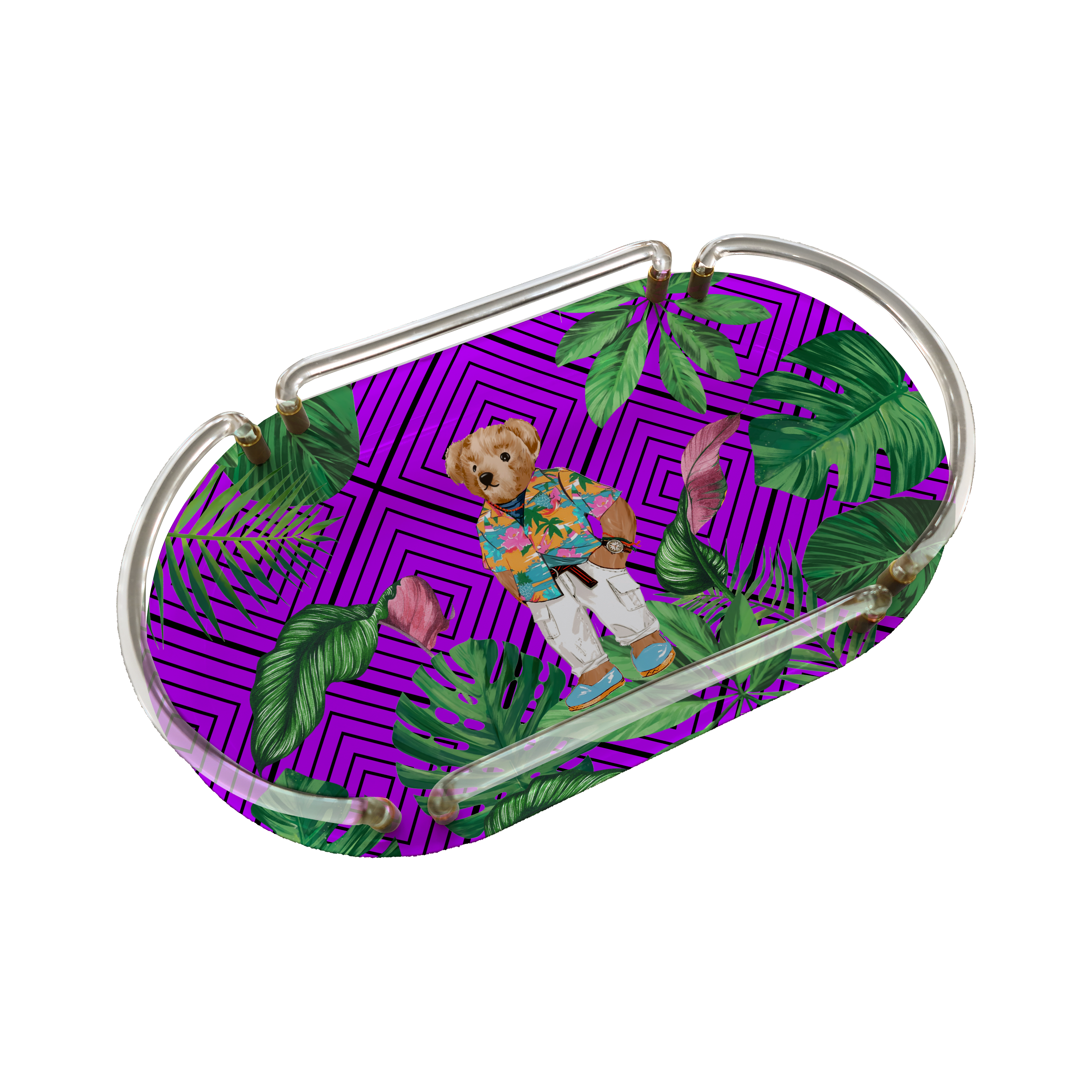 Summer Purple Teddy Bear Oval Pleksi Tepsi